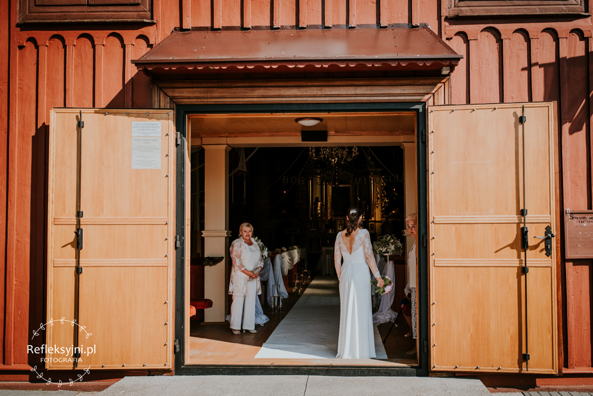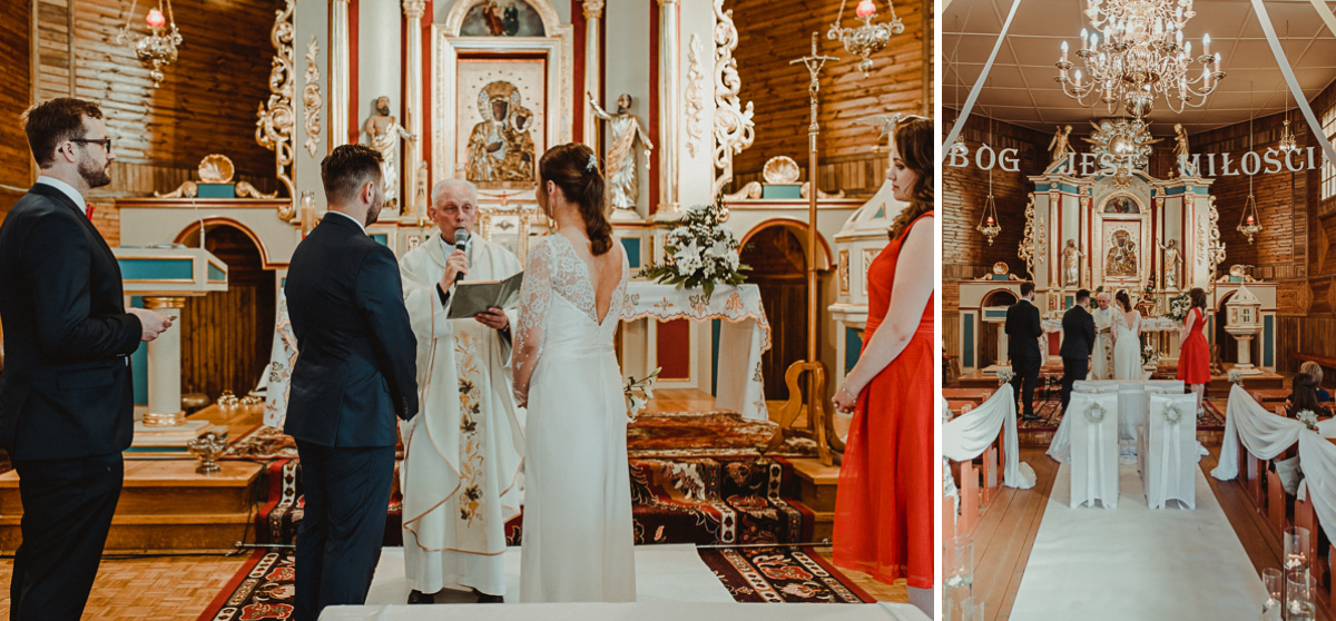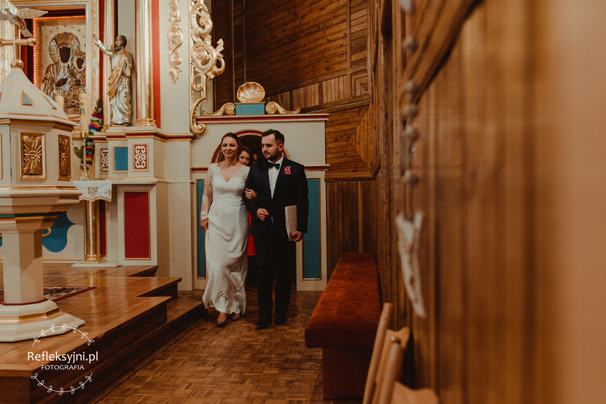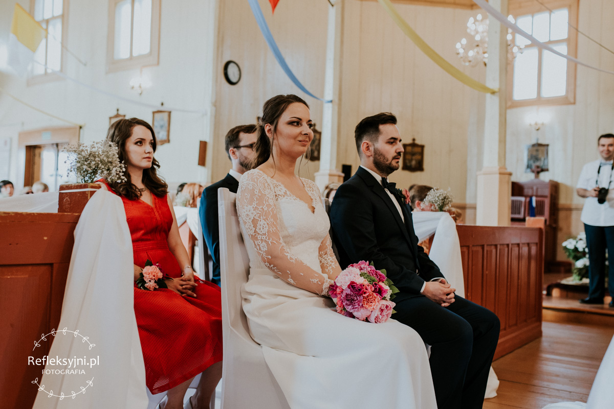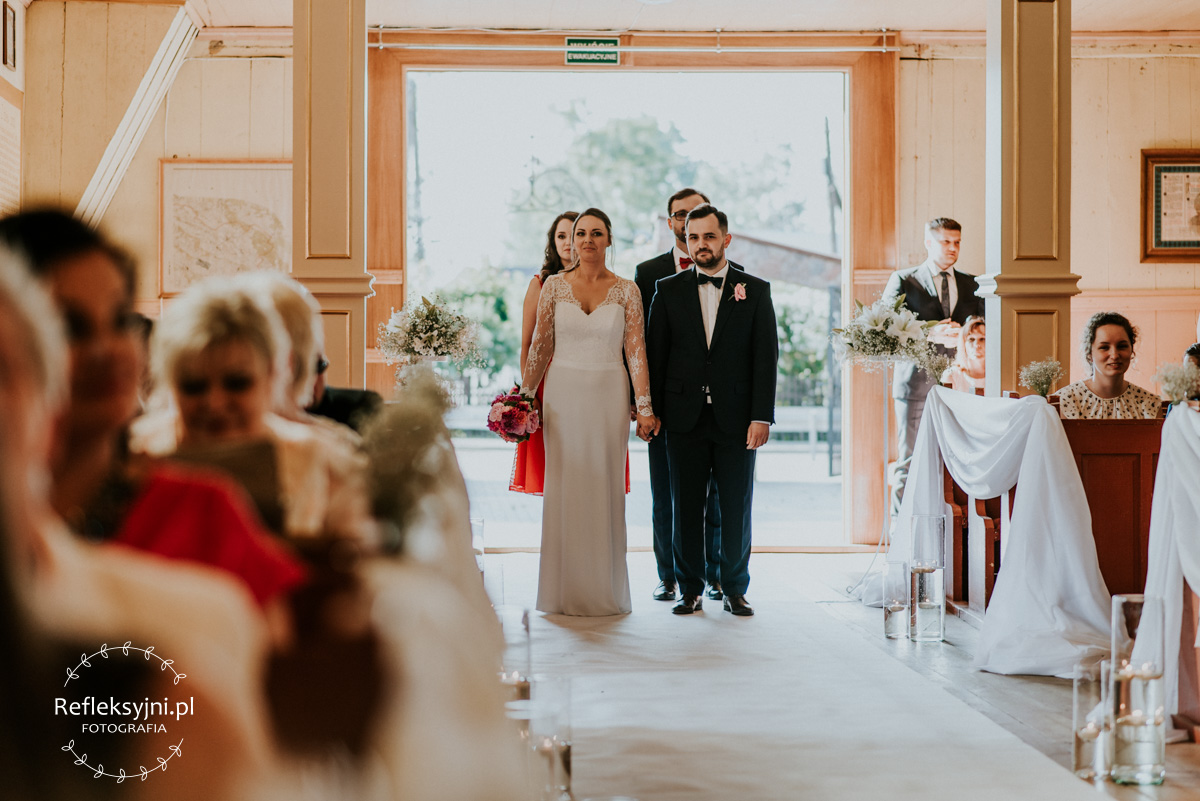 Z estetyką i kolorami podczas tego dnia było jak z emocjami w filmach Hitchcocka, który mawiał: „Film powinien zaczynać się od trzęsienia ziemi, potem zaś napięcie ma nieprzerwanie rosnąć”. Wkraczając do mieszkania w Ostrołęce zobaczyliśmy biele, szarości, brązy oraz mądrze rozmieszczone mocniejsze akcenty i się zachwyciliśmy (dygresja: szare ściany bardzo ułatwiają nam pracę, a żeby zrozumieć dlaczego, trzeba odpowiedzieć sobie na pytanie – jak aparat mierzy światło? Aparat wszystkie pomiary sprowadza nie do bieli czy czerni, a do tego co jest pomiędzy, czyli szarości. Większość kadrów składa się z elementów ciemniejszych i jaśniejszych. Aparat przyjmuje, że razem fotografowane obiekty powinny być zatem szare i odbić 18% światła. Gdy fotografujemy białe zaproszenie ślubne na białym tle, aparat uzna, że światła jest za dużo i w efekcie przyciemni cały kadr. Analogicznie, gdy fotografujemy czarne buty ślubne na czarnym tle zdjęcie zostanie automatycznie rozjaśnione. Pojawiając się u Pauliny i Adama zastaliśmy zatem idealne warunki. Podobne zależności występują na sali – jak ognia unikajcie pomarańczowych sal, a wybierzcie proste białe, beżowe lub rustykalne drewniane ). Mieszkanie było idealnym tłem, ale też tylko tłem, ponieważ na pierwszy plan wysunęła się Panna Młoda w fantastycznej zwiewnej sukni (serio! uwielbiamy zwiewne, lekkie suknie), do której bardzo szybko dołączył Pan Młody ze stylowo dobranymi dodatkami. Po błogosławieństwie ruszyliśmy w dłuższą drogę do urokliwego drewnianego Kościoła Rzymskokatolickiego pw. Świętego Michała Archanioła w Brodowych Łąkach. W parafii ksiądz, który na wstępie zapowiedział, że Msza u Niego trwa zawsze 55 minut. I po 55 minutach (sprawdzone z zegarkiem w ręku w aparacie) przenieśliśmy się do sali oddalonej o 800 metrów, o dźwięcznie brzmiącej nazwie Sala „Patola” w Zawadach. Tam sprawy działy się jeszcze szybciej – porywający pierwszy taniec, duet DJ-ów nadający rytm całej imprezie, miniplener z Parą Młodą w czasie trwania świetlnej złotej godziny, drink bar, tańce, konkursy muzyczne, mnóstwo dobrej zabawy okraszonej oczepinami i pysznym tortem.
