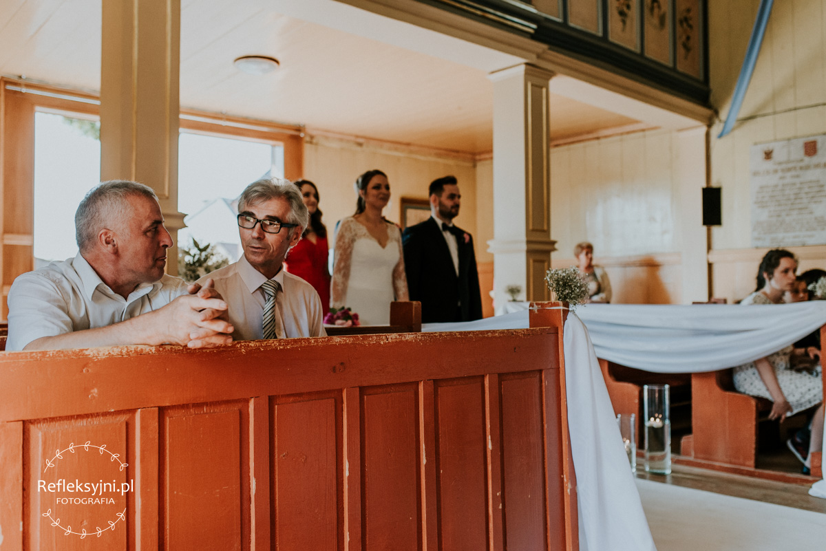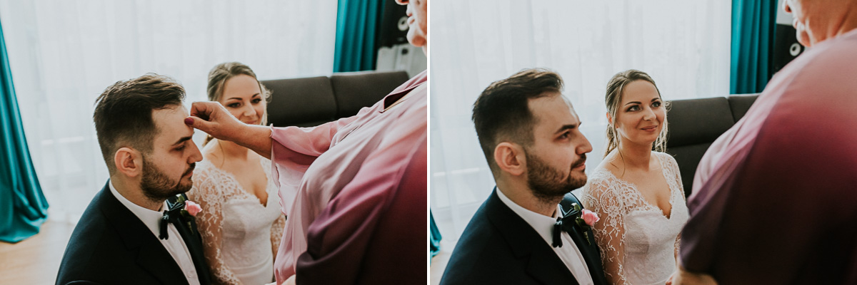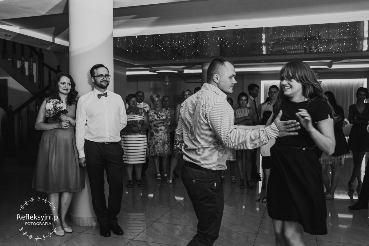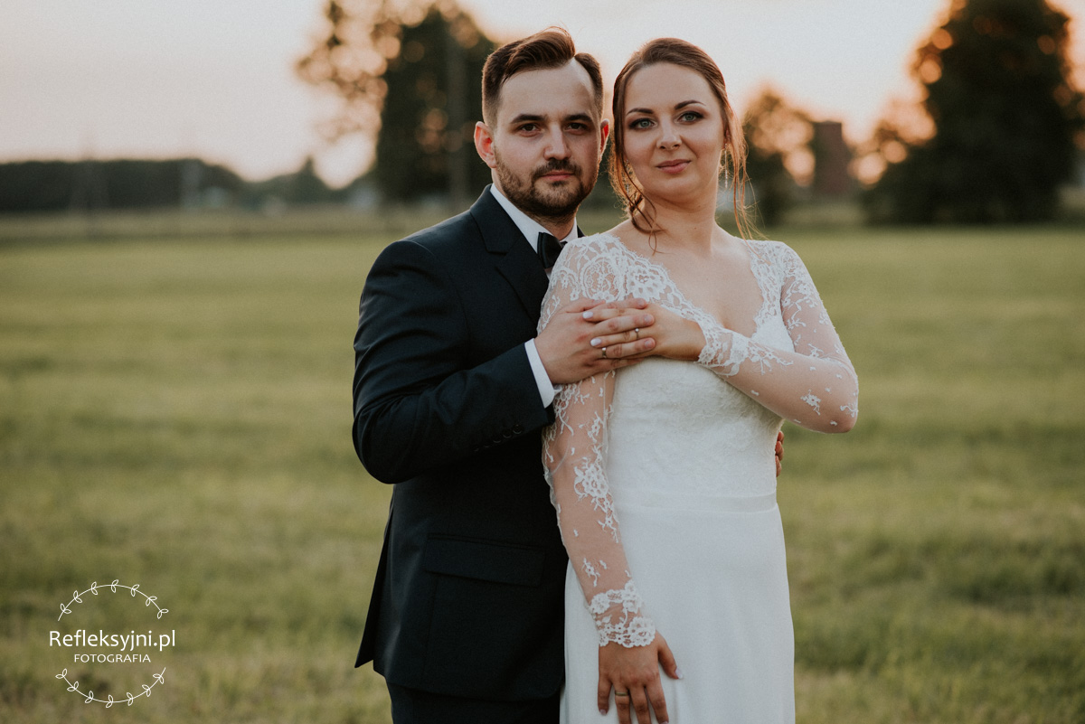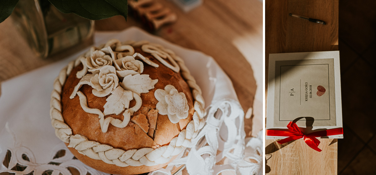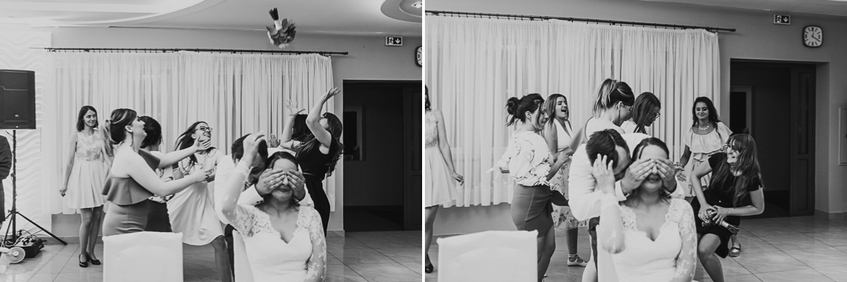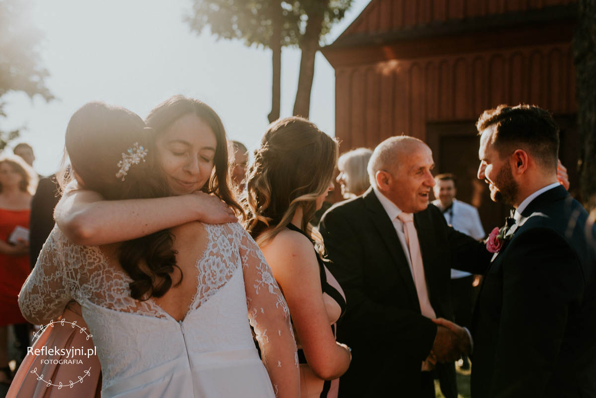 Z estetyką i kolorami podczas tego dnia było jak z emocjami w filmach Hitchcocka, który mawiał: „Film powinien zaczynać się od trzęsienia ziemi, potem zaś napięcie ma nieprzerwanie rosnąć”. Wkraczając do mieszkania w Ostrołęce zobaczyliśmy biele, szarości, brązy oraz mądrze rozmieszczone mocniejsze akcenty i się zachwyciliśmy (dygresja: szare ściany bardzo ułatwiają nam pracę, a żeby zrozumieć dlaczego, trzeba odpowiedzieć sobie na pytanie – jak aparat mierzy światło? Aparat wszystkie pomiary sprowadza nie do bieli czy czerni, a do tego co jest pomiędzy, czyli szarości. Większość kadrów składa się z elementów ciemniejszych i jaśniejszych. Aparat przyjmuje, że razem fotografowane obiekty powinny być zatem szare i odbić 18% światła. Gdy fotografujemy białe zaproszenie ślubne na białym tle, aparat uzna, że światła jest za dużo i w efekcie przyciemni cały kadr. Analogicznie, gdy fotografujemy czarne buty ślubne na czarnym tle zdjęcie zostanie automatycznie rozjaśnione. Pojawiając się u Pauliny i Adama zastaliśmy zatem idealne warunki. Podobne zależności występują na sali – jak ognia unikajcie pomarańczowych sal, a wybierzcie proste białe, beżowe lub rustykalne drewniane ). Mieszkanie było idealnym tłem, ale też tylko tłem, ponieważ na pierwszy plan wysunęła się Panna Młoda w fantastycznej zwiewnej sukni (serio! uwielbiamy zwiewne, lekkie suknie), do której bardzo szybko dołączył Pan Młody ze stylowo dobranymi dodatkami. Po błogosławieństwie ruszyliśmy w dłuższą drogę do urokliwego drewnianego Kościoła Rzymskokatolickiego pw. Świętego Michała Archanioła w Brodowych Łąkach. W parafii ksiądz, który na wstępie zapowiedział, że Msza u Niego trwa zawsze 55 minut. I po 55 minutach (sprawdzone z zegarkiem w ręku w aparacie) przenieśliśmy się do sali oddalonej o 800 metrów, o dźwięcznie brzmiącej nazwie Sala „Patola” w Zawadach. Tam sprawy działy się jeszcze szybciej – porywający pierwszy taniec, duet DJ-ów nadający rytm całej imprezie, miniplener z Parą Młodą w czasie trwania świetlnej złotej godziny, drink bar, tańce, konkursy muzyczne, mnóstwo dobrej zabawy okraszonej oczepinami i pysznym tortem.
