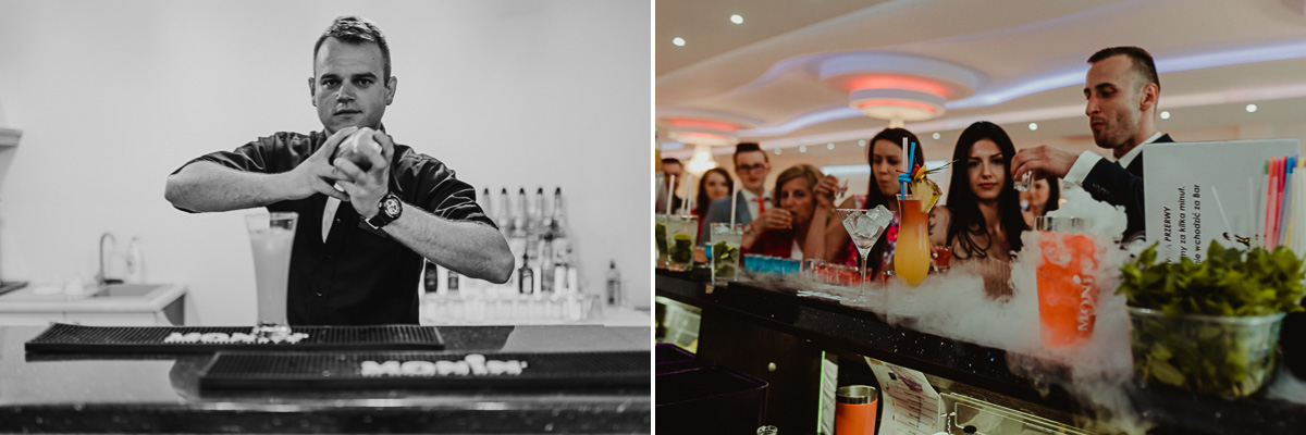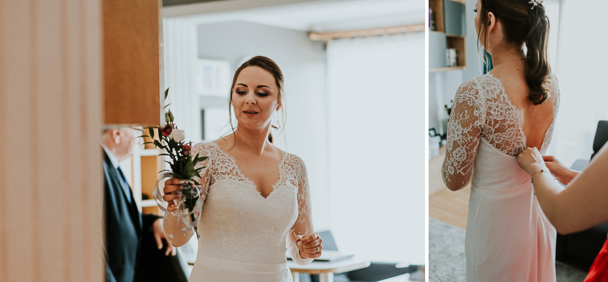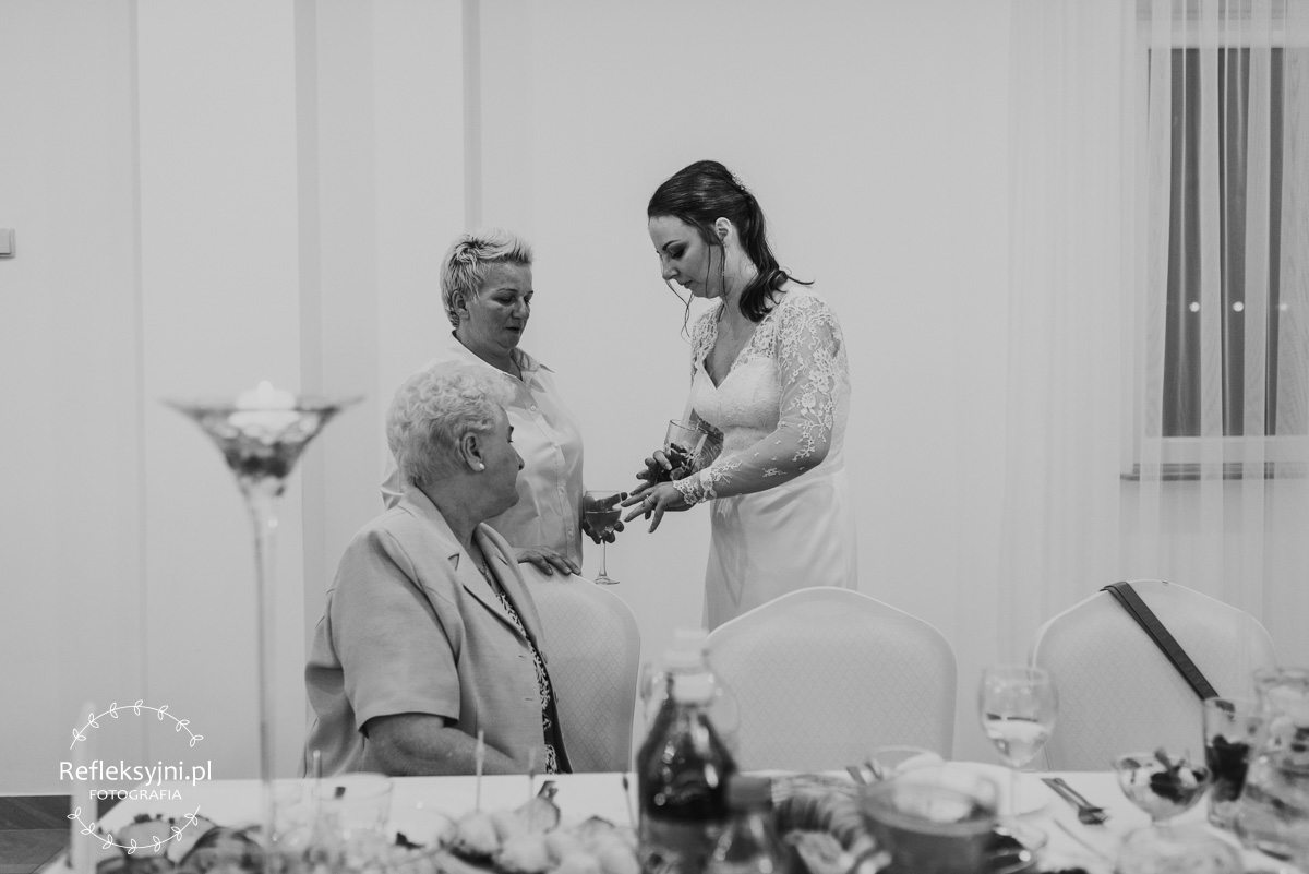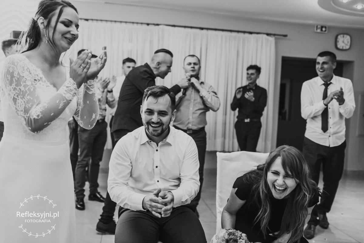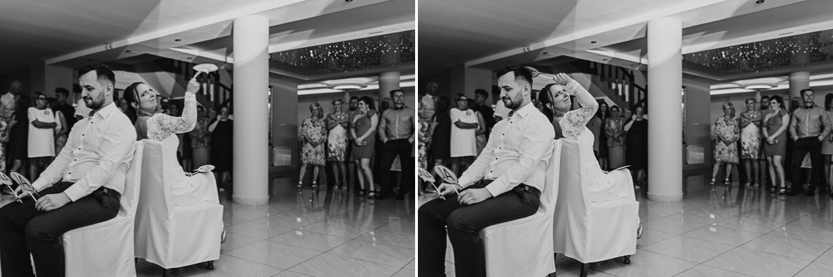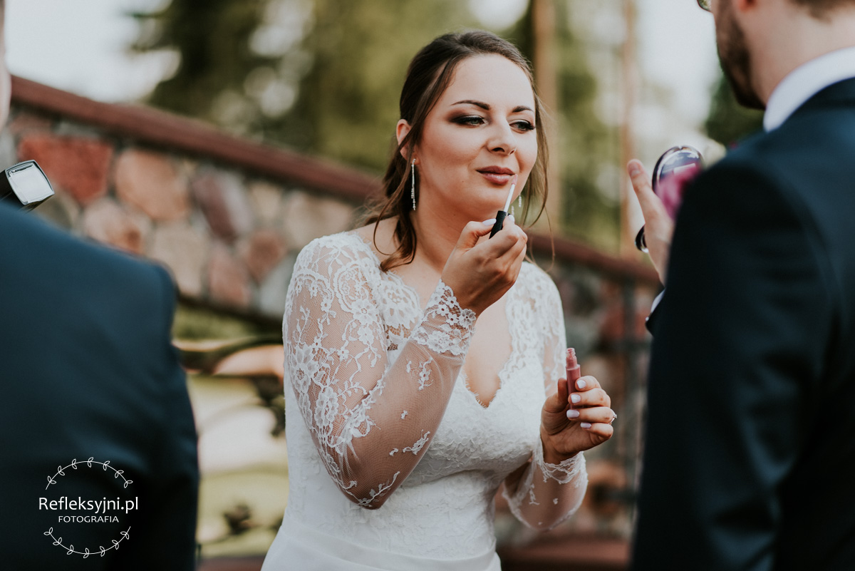 Z estetyką i kolorami podczas tego dnia było jak z emocjami w filmach Hitchcocka, który mawiał: „Film powinien zaczynać się od trzęsienia ziemi, potem zaś napięcie ma nieprzerwanie rosnąć”. Wkraczając do mieszkania w Ostrołęce zobaczyliśmy biele, szarości, brązy oraz mądrze rozmieszczone mocniejsze akcenty i się zachwyciliśmy (dygresja: szare ściany bardzo ułatwiają nam pracę, a żeby zrozumieć dlaczego, trzeba odpowiedzieć sobie na pytanie – jak aparat mierzy światło? Aparat wszystkie pomiary sprowadza nie do bieli czy czerni, a do tego co jest pomiędzy, czyli szarości. Większość kadrów składa się z elementów ciemniejszych i jaśniejszych. Aparat przyjmuje, że razem fotografowane obiekty powinny być zatem szare i odbić 18% światła. Gdy fotografujemy białe zaproszenie ślubne na białym tle, aparat uzna, że światła jest za dużo i w efekcie przyciemni cały kadr. Analogicznie, gdy fotografujemy czarne buty ślubne na czarnym tle zdjęcie zostanie automatycznie rozjaśnione. Pojawiając się u Pauliny i Adama zastaliśmy zatem idealne warunki. Podobne zależności występują na sali – jak ognia unikajcie pomarańczowych sal, a wybierzcie proste białe, beżowe lub rustykalne drewniane ). Mieszkanie było idealnym tłem, ale też tylko tłem, ponieważ na pierwszy plan wysunęła się Panna Młoda w fantastycznej zwiewnej sukni (serio! uwielbiamy zwiewne, lekkie suknie), do której bardzo szybko dołączył Pan Młody ze stylowo dobranymi dodatkami. Po błogosławieństwie ruszyliśmy w dłuższą drogę do urokliwego drewnianego Kościoła Rzymskokatolickiego pw. Świętego Michała Archanioła w Brodowych Łąkach. W parafii ksiądz, który na wstępie zapowiedział, że Msza u Niego trwa zawsze 55 minut. I po 55 minutach (sprawdzone z zegarkiem w ręku w aparacie) przenieśliśmy się do sali oddalonej o 800 metrów, o dźwięcznie brzmiącej nazwie Sala „Patola” w Zawadach. Tam sprawy działy się jeszcze szybciej – porywający pierwszy taniec, duet DJ-ów nadający rytm całej imprezie, miniplener z Parą Młodą w czasie trwania świetlnej złotej godziny, drink bar, tańce, konkursy muzyczne, mnóstwo dobrej zabawy okraszonej oczepinami i pysznym tortem.